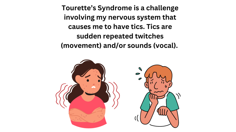 Tourette's Syndrome is a challenge involving the nervous system. The child will exhibit vocal and/or motor tics that are sudden repeated movements. These movement are uncontrollable and working on strategies to overcome these challenges.